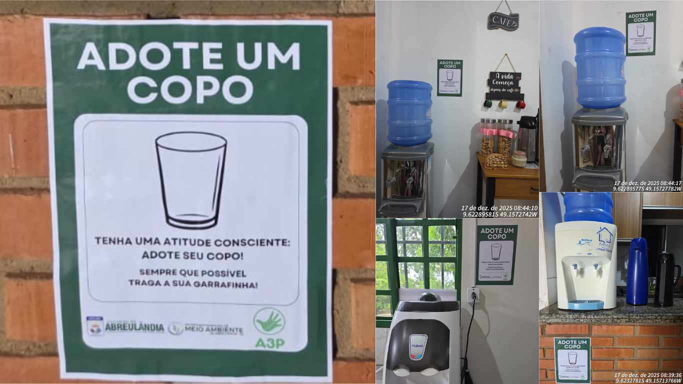 A Prefeitura Municipal de Abreulândia – TO, por meio da Secretaria Municipal de Meio Ambiente, realizou no dia 17 de dezembro de 2025, às 08h20, na sede da Prefeitura Municipal, uma ação de sensibilização ambiental, no âmbito da Agenda Ambiental na Administração Pública – A3P, com foco na redução do uso de copos descartáveis e no incentivo à adoção de práticas sustentáveis no ambiente institucional.
