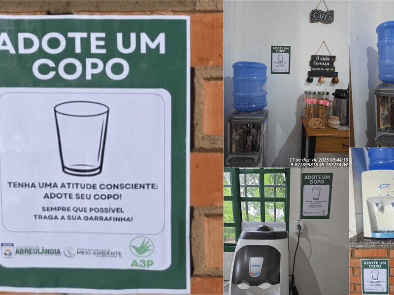A Prefeitura Municipal de Abreulândia – TO, por meio da Secretaria Municipal de Meio Ambiente, realizou no dia 17 de dezembro de 2025, às 08h20, na sede da Prefeitura Municipal, uma ação de sensibilização ambiental, no âmbito da Agenda Ambiental na Administração Pública – A3P, com foco na redução do uso de copos descartáveis e no incentivo à adoção de práticas sustentáveis no ambiente institucional.